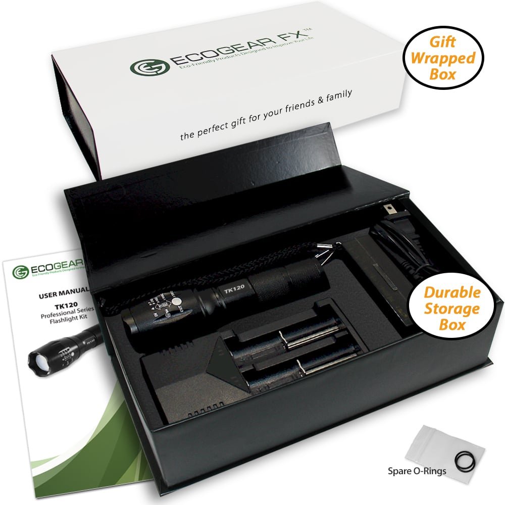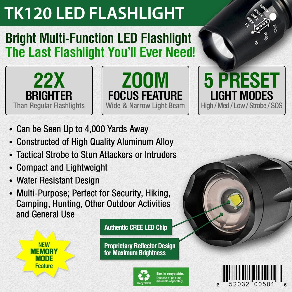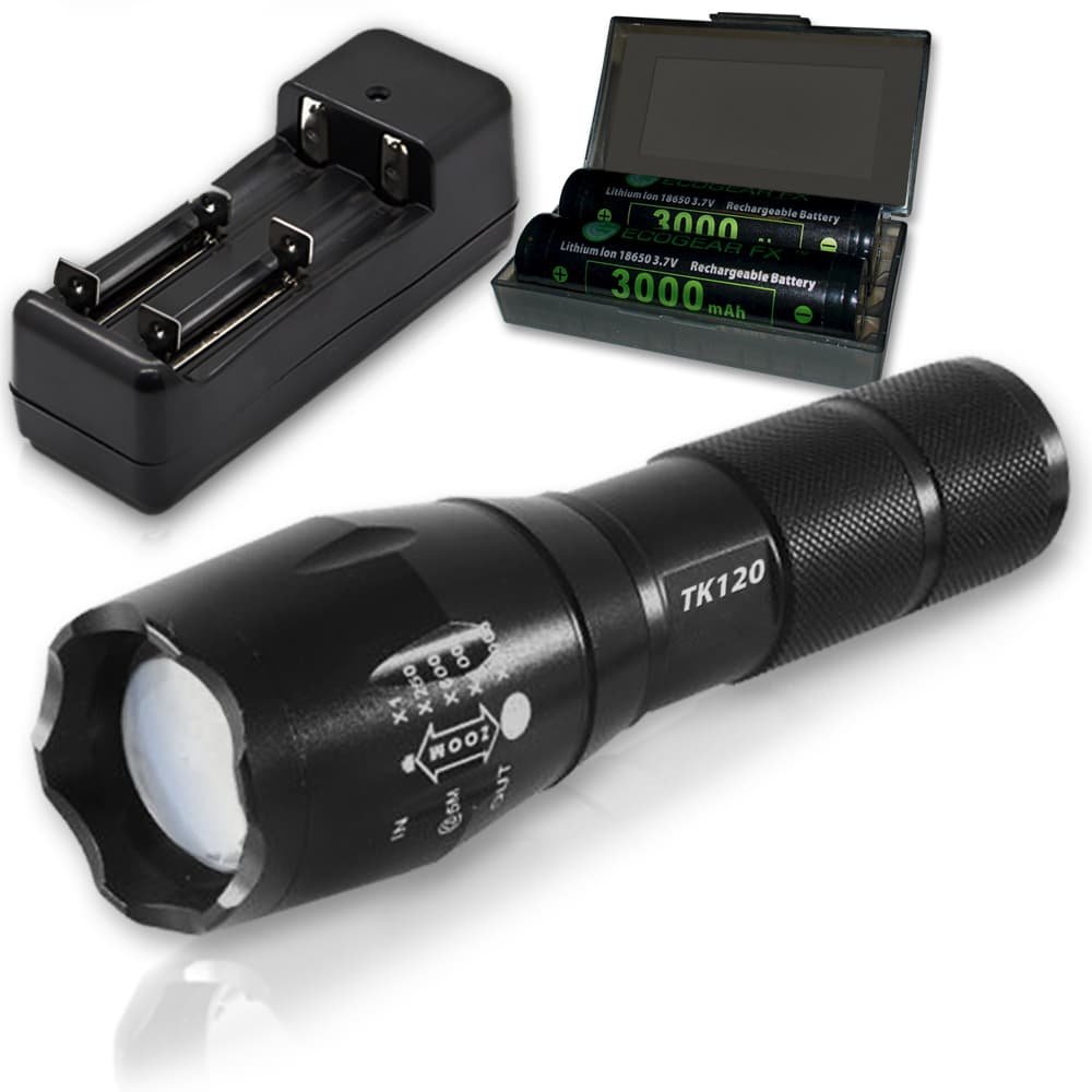 LED Tactical Flashlight KitThe TK120 LED Flashlight is a complete professional LED flashlight kit for home use, outdoor activities, security and professionals. Equipped with multiple light modes, the TK120 LED Tactical Flashlight delivers excellent light spread when using the zoom feature (adjustable focus). Constructed using high-quality standards, the TK120 Professional LED Flashlight is made of aircraft grade aluminum alloy with a hardened anodized finish. So when the going gets tough the TK120 Flashlight gives you high-strength and durability needed for nearly any situation. As an extremely rugged tactical flashlight, the TK120LED Flashlight Kit includes two high capacity lithium-ion rechargeable batteries and a rapid battery charger. Ideal for many situations and uses, the TK120 makes a perfect LED tactical flashlight with strobe. Not only is it great for professionals but makes a great flashlight kit for tactical situations, family camping, hunting trips, fishing and night patrols. It is a very useful LED emergency flashlight to aid in emergency assistance and natural disasters including earthquakes, hurricanes and storms.