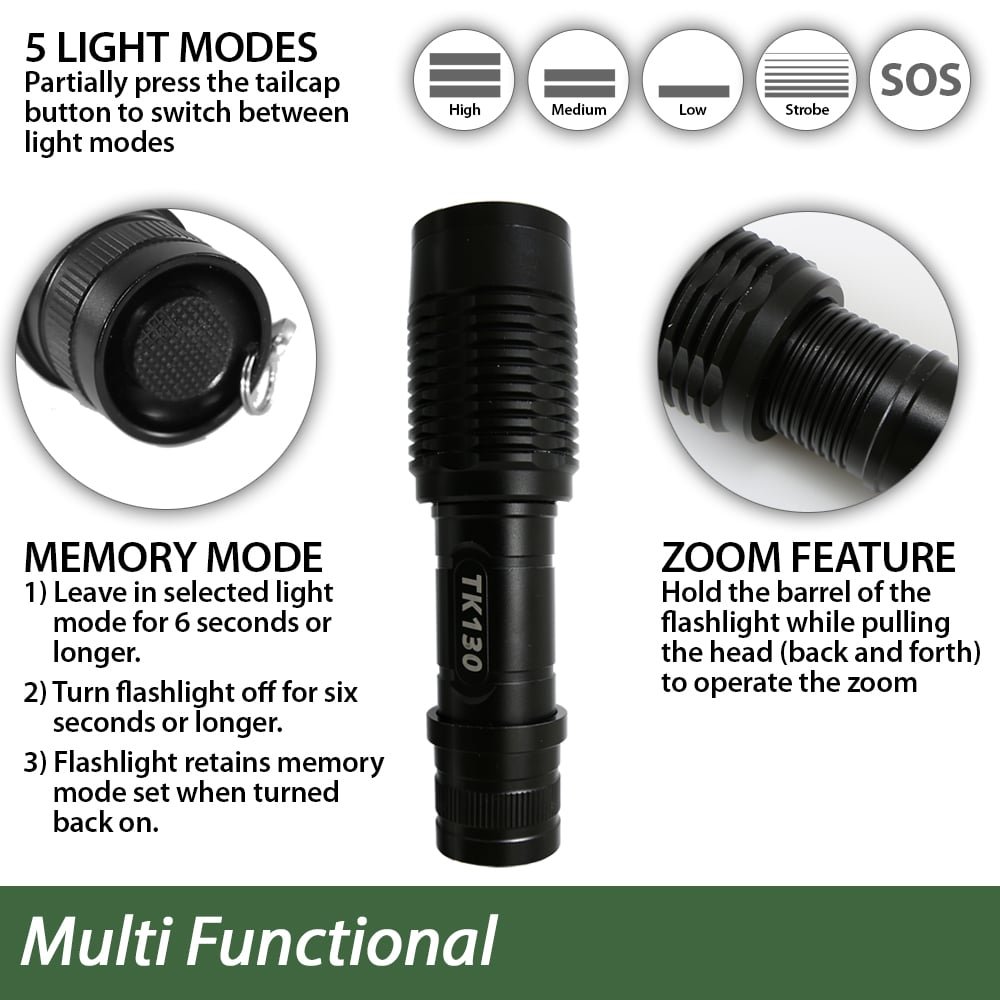 5 Different Light ModesThe TK130X Flashlight offers sound functionality plus a measure of safety whether you’re out jogging or the electricity just went out and left the whole house dark. You can stand it up on a flat surface to illuminate an entire room. This small rechargeable camping flashlight just may be the best flashlight for camping that you’ve ever owned. The pocket-friendly compact chassis features an anti-slip finish so it won’t slip out of your hands in an emergency. If you’re searching for a sturdy but small rechargeable camping flashlight, the TK130 LED is a perfect choice. We think you’ll agree that this is the best flashlight for camping.