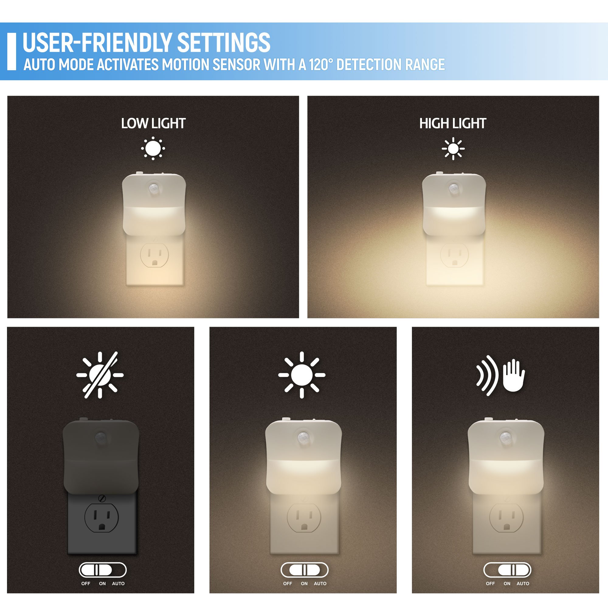 • SMART MOTION SENSOR: More than just a nightlight, this light detects 120° of movement and when set in auto mode automatically turns on/off. Plug-in the motion activated night light in any power outlet where light is needed.